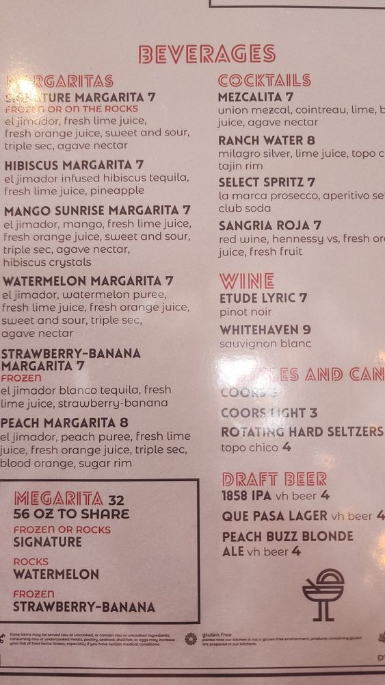 oz, frozen with Milagro silver tequila or on the rocks with El Jimador, fresh lime, fresh orange, sweet & sour, triple sec, agave nectar